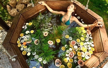 Остудиться в прохладной воде бассейна летом или согреться в холода прямо под открытым небом на территории барнхауза "Зима". Подсветка воды сделает купание интересным для детей и порадует взрослых красивыми фотоснимками в купели.