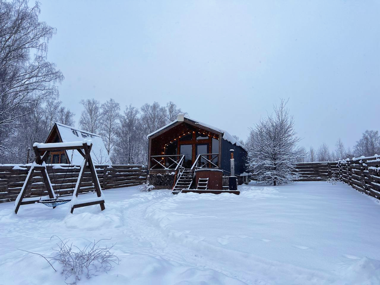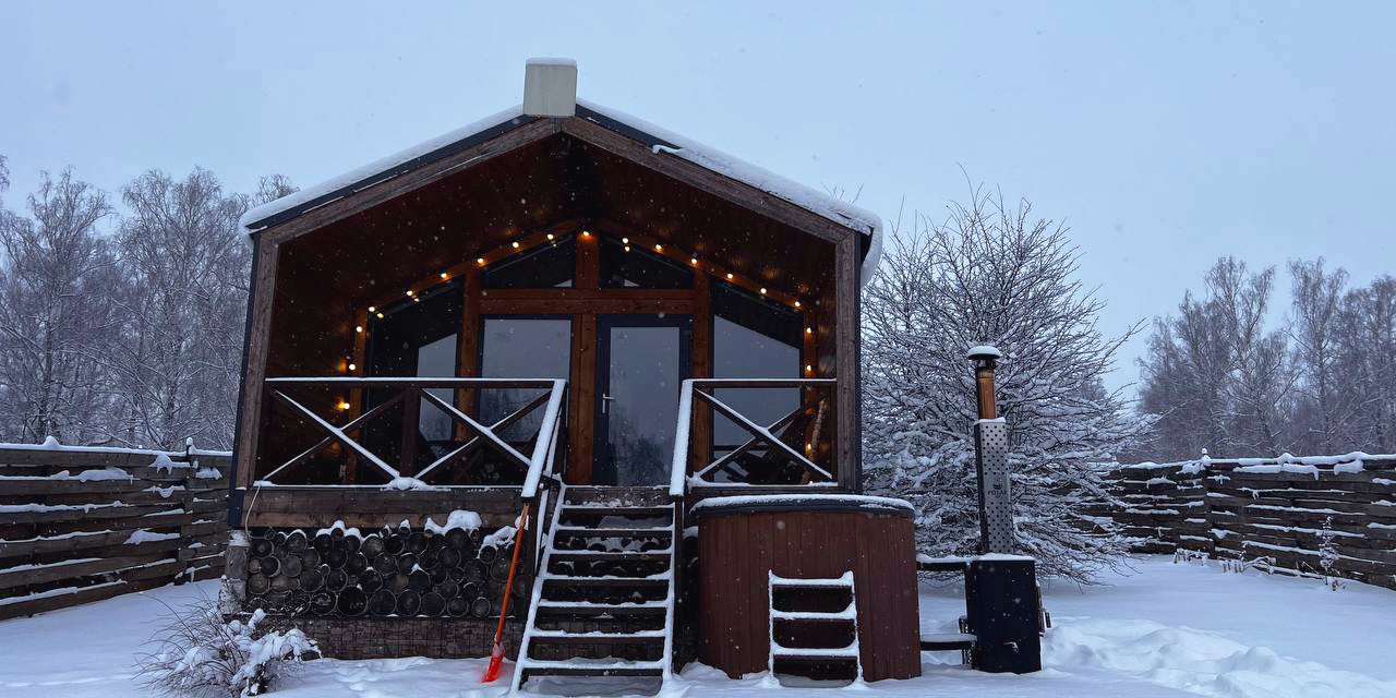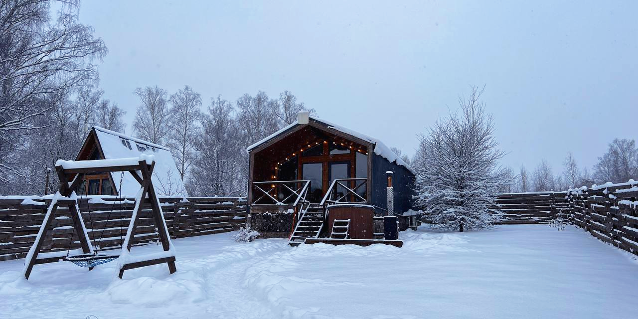 Двухуровневый дом Барнхаус для отдыха включает гостиную, объединенную с оборудованной кухонной зоной, спальню и санузел, есть просторная терраса. Домик имеет огороженную территорию, которая обеспечивает приватность. При этом расположен на опушке леса для максимального наслаждения отдыхом на природе.