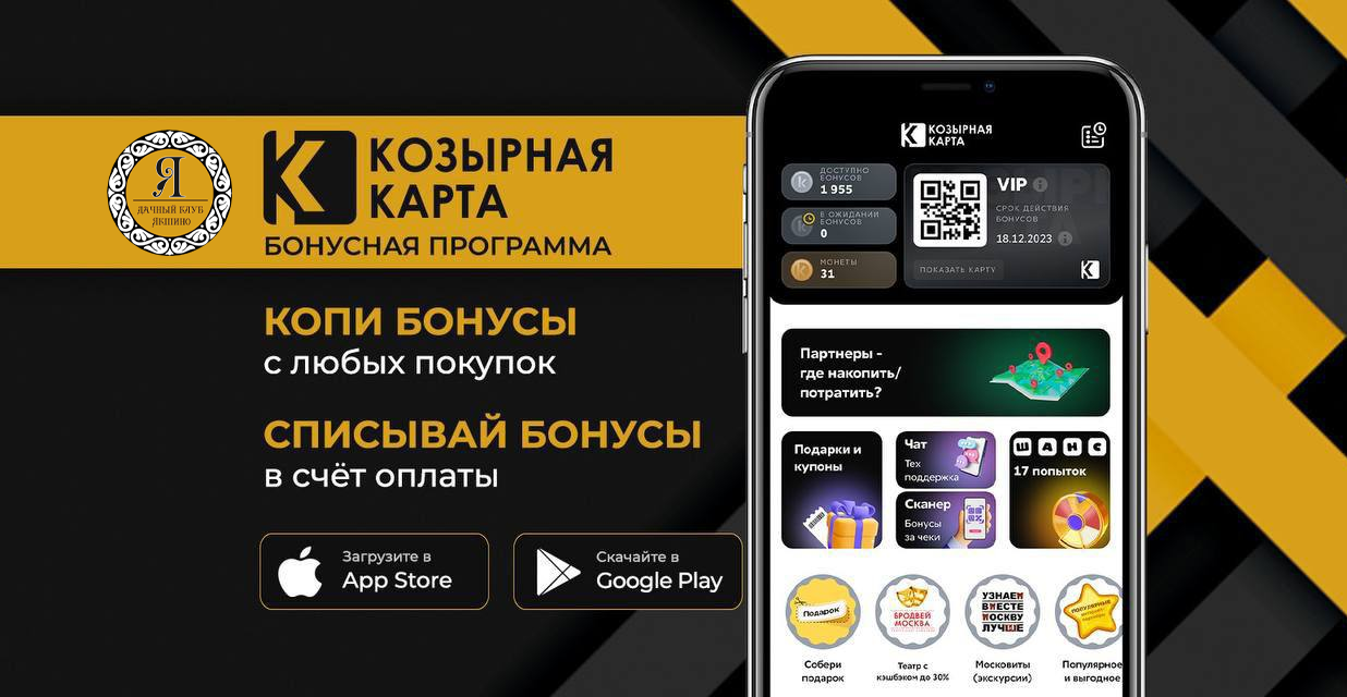 Скачайте приложение «Козырная карта» в App Store или Google Play и пользуйтесь бонусами при бронировании отдыха в дачном клубе «Якшино».